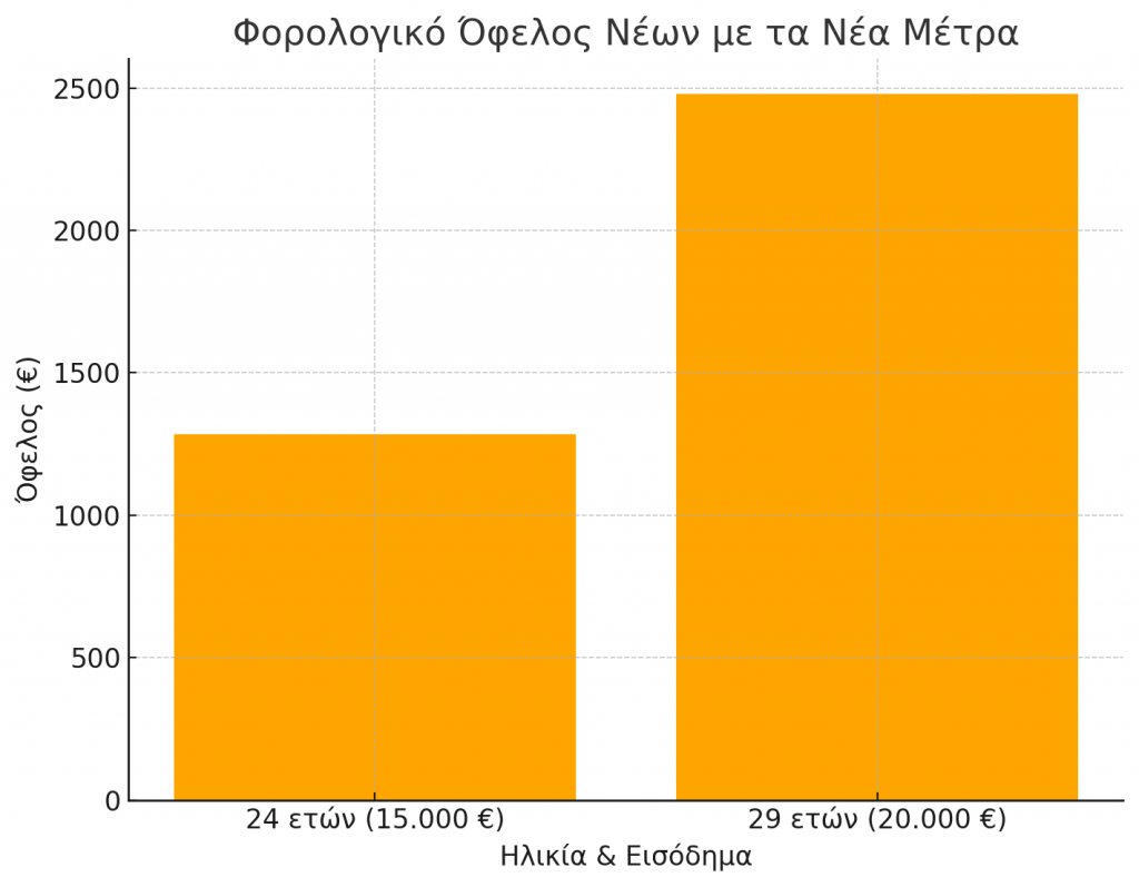 - Παράδειγμα: εργαζόμενος 24 ετών με 15.000 € κέρδος ≈ 1.283 €· με 20.000 € εισόδημα, όφελος ≈ 2.480 €.